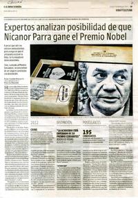 Expertos analizan posibilidad de que Nicanor Parra gane el premio Nobel [artículo] / Carolina Marcos Ch. La Discusión (Diario : Chillán, Chile)-- mar. 7, 2013, p. 19. .