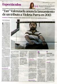 "Tan" Valenzuela anuncia lanzamiento de un tributo a Violeta Parra en 2013 [artículo] / Catalina Garcés Rondanelli. Crónica Chillán (Diario : Chillán, Chile)-- feb. 15, 2013, p. 14. .