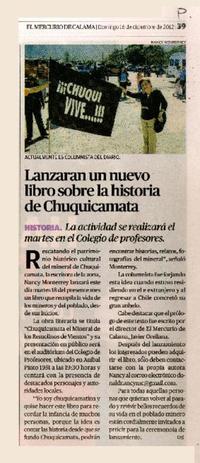Lanzaran un nuevo libro sobre la historia de Chuquicamata. [artículo] El Mercurio de Calama (Diario : Calama, Chile)-- dic. 16, 2012,p. 39. .