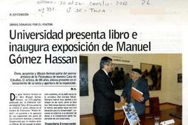 Universidad presenta libro e inaugura exposición de Manuel Gómez Hassan [artículo] / M.A. Universidad de Talca (Diario : Talca, Chile)-- no. 331, ago. 20 al 26, 2012, p. 6. .