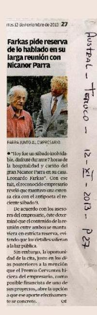 Farkas pide reserva de lo hablado en su larga reunión con Nicanor Parra [artículo] / Diario Austral (Diario : Temuco, Chile)-- nov. 12, 2013, p. 27 .