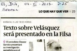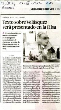 Texto sobre Velásquez será presentado en la Filsa [artículo] / El Día (Diario : La Serena, Chile)-- nov. 7, 2013, p. 25 .