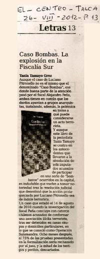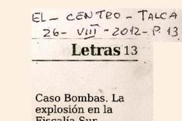 Caso bombas. La explosión en la fiscalía sur. [artículo] El Centro (Diario : Talca, Chile)-- ago. 26, 2012, p. 13. .