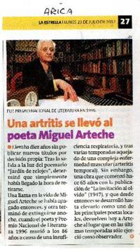 Una artritis se llevó al poeta Miguel Arteche. [artículo] La Estrella I (Diario : Arica, Chile)-- jul. 23, 2012, p. 27. .