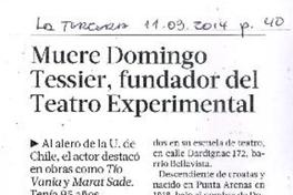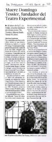 Muere Domingo Tessier, fundador del Teatro Experimental [artículo] / Denisse Espinoza La Tercera (Diario : Santiago, Chile)-- mar. 11 2014, p. 40 .