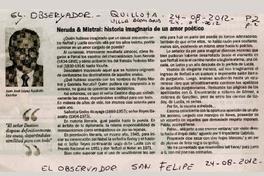 Neruda & Mistral: historia imaginaria de un amor poético [artículo] / Juan José López Azcaráte. El Observador (Diario : Quillota, Chile)-- ago. 8, 24, 2012, p. 2. .