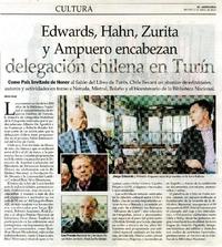 Edwards, Hahn, Zurita y Ampuero encabezan delegación chilena en Turín [artículo] / Iñigo Díaz. El Mercurio (Diario : Santiago, Chile)-- abr. 2, 2013, p. A10 .