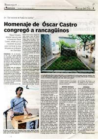 Homenaje de Oscar Castro congrego a rancagüinos [artículo] / Patricia Morales Serazzi. El Libertador (Diario : Rancagua, Chile)-- nov. 2, 2012, p. 3. .