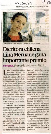 Escritora chilena Lina Meruane gana importante premio. [artículo] Diario Austral (Diario : Valdivia, Chile)-- oct. 30, 2012, p. 26. .