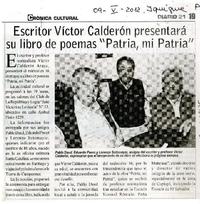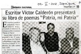 Escritor Víctor Calderón presentará su libro de poemas "Patria, mi Patria". [artículo] Diario 21 (Diario : Iquique, Chile)-- mayo 9, 2012, p. 19. .