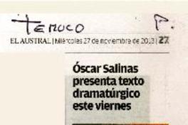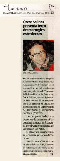 Óscar Salinas presenta texto dramatúrgico este viernes [artículo] / El Austral (Diario : Temuco, Chile)-- nov. 27, 2013, p. 27 .