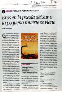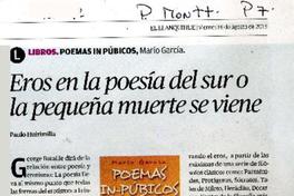 Eros en la poesía del sur o la pequeña muerte viene [artículo] / Paulo Huirimilla El Llanquihue (Diario : Puerto Montt, Chile)-- ago. 16, 2013, p. 7 .