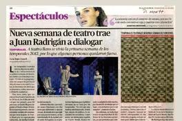 Nueva semana de teatro trae a Juan Radrigán a dialogar [artículo] / Oscar Rojas Connell. El Llanquihue (Diario : Puerto Montt, Chile)-- jul. 14, 2012, p. 26. .