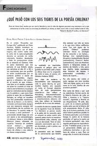 ¿Qué pasó con los seis tigres de la poesía chilena? [artículo] / Daniel Rojas Pachas. Revista Multitud (Revista : Santiago, Chile)-- no. 4 (sept. 2010), p. 44-47. .