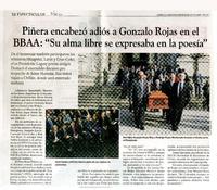 Piñera encabezó adiós a Gonzalo Rojas en el BBAA: "su alma libre se expresaba en la poesía". [artículo] La Segunda (Diario : Santiago, Chile) abr. 27, 2011, p. 32. .