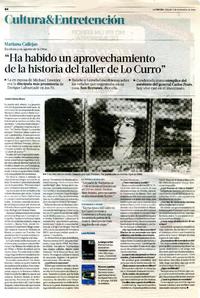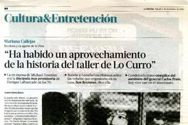 "Ha habido un aprovechamiento de la historia del taller de Lo Curro" [artículo] / Andrés Gómez Bravo La Tercera (Diario : Santiago, Chile)-- nov. 6, 2010, p. 84 .