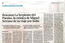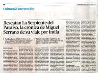 Rescatan La Serpiente del Paraíso, la crónica de Miguel Serrrano de su viaje por India [artículo] / Roberto Careaga C. La Tercera (Diario : Santiago, Chile)-- abr. 26, 2014, p. 90-91 .
