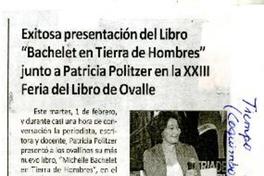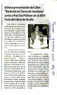 Exitosa presentación del libro "Bachelet en tierra de hombres" junto a Patricia Politzer en la XXIII fería del libro de Ovalle. [artículo] Tiempo (Diario : Coquimbo, Chile)-- feb. 4, 2011, p. 23. .