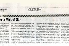 Volver sobre la Mistral (II) [artículo] / Sergio Gaytán M. El Mercurio (Diario : Antofagasta, Chile)-- ene. 31, 2011, p. 22. .