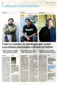 Todo es cancha: la antología que reúne a escritores nacionales entorno al fútbol [artículo] / Javier García La Tercera (Diario : Santiago, Chile)-- may. 12, 2014, p. 38 .