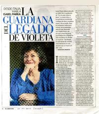 Desde Italia habla Isabel Parra: La guardiana del legado de Violeta [artículo] / Magdalena Andrade El Mercurio (Diario : Santiago, Chile)-- jun. 20, 2014, p. 14-15 (Wikén) .