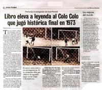 Libro eleva a leyenda al Colo Colo que jugó histórica final en 1973 [artículo] / Fabián Llanca La Últimas Noticias (Diario : Santiago, Chile)-- jul. 8, 2014, p. 42 .