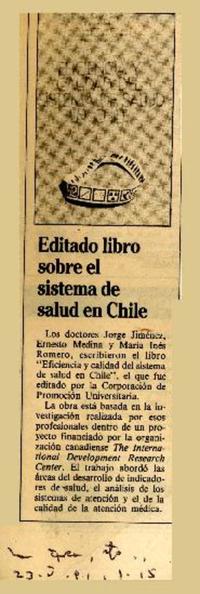 Editado libro sobre el sistema de salud en Chile. [artículo] La Época (Diario : Santiago, Chile)-- mayo 23, 1991, p. 15. .