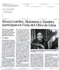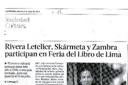 Rivera Letelier, Skarmeta y Zambra paticipan en Feria del Libro de Lima [artículo] / Roberto Careaga C. La Tercera (Diario : Santiago, Chile)-- jul. 05, 2014, p. 85 .