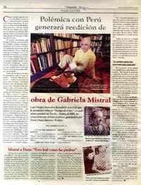 Polémica con Perú generará reedición de obra de Gabriela Mistral [artículo] / Amparo Lavín A. La Segunda (Diario : Santiago, Chile)-- ago. 14, 2007, p. 36. .