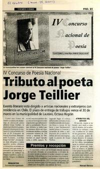 Tributo al poeta Jorge Teillier [artículo] / Manuel Herrera. El Centro (Diario : Talca, Chile)-- mar. 15, 2001, p. 21. .