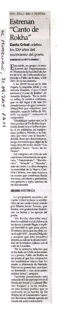 Estrenan "Canto de Rokha" [artículo] Romina de la Sotta Donoso