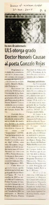 ULS otorga grado Doctor Honoris Causae al poeta Gonzalo Rojas. [artículo] El Ovallino (Diario : Ovalle, Chile)-- mar. 31, 2005, p. 5. .
