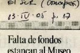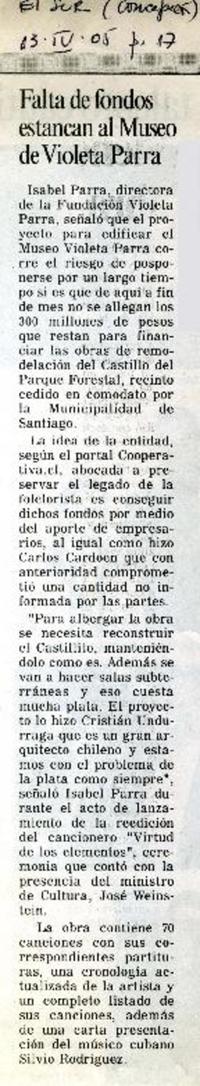 Falta de fondos estancan al Museo de Violeta Parra. [artículo] El Sur (Diario : Concepción, Chile)-- abr. 13, 2005, p. 17. .