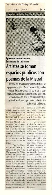Artistas se toman espacios públicos con poemas de la Mistral. [artículo] El Ovallino (Diario : Ovalle, Chile))-- abr. 15, 2005, p. 5. .