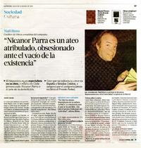 "Nicanor Parra es un ateo atribulado, obsesionado ante el vacío de la existencia" [artículo] / Javier García La Tercera (Diario : Santiago, Chile)-- sep. 8, 2014, p. 37 .