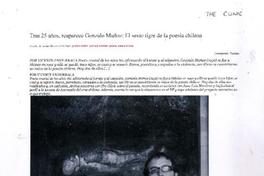 Tras 25 años, reaparece Gonzalo Muñoz: el sexto tigre de la poesía chilena [artículo] / Vicente Undurraga The Clinic (Diario : Santiago, Chile)-- Octubre, 2014 .