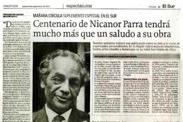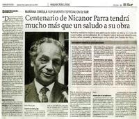 Centenario de Nicanor Parra tendrá mucho más que un saludo a su obra [artículo] / Álvaro Peña Saavedra El Sur (Diario : Concepción, Chile)-- sep. 4, 2014, p. 23. 1 pagina : Incluye ilustración en blanco y negro ; texto .