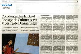 Con denuncias hacia el Consejo de Cultura parte Muestra de Dramaturgia [artículo] / Pedro Bahamondes Ch. La Tercera (Diario : Santiago, Chile) -- oct. 7, 2014, p.41 .