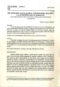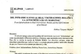 Del infrarrealismo al real visceralismo: Bolaño y la autocrítica de un marginal [artículo] / Ainhoa Vásquez Mejías Revista Alpha (Revista : Osorno, Chile)-- n°39 (Diciembre 2014) p. 57-68 .