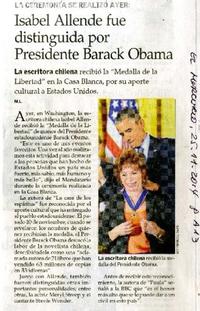 Isabel Allende fue distinguida por Presidente Barack Obama [artículo] / M.L. El Mercurio (Diario : Santiago, Chile)-- nov. 25, 2014, p. A13 .