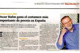 Oscar Hahn gana el certamen más importante de poesía en España [artículo] / La Segunda (Diario : Santiago, Chile)-- nov. 13, 2014, p. 27 .