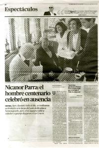 Nicanor Parra: el hombre centenario celebró en ausencia [artículo] / Gloria Castañeda A. El Mercurio (Diario : Valparaíso, Chile) septiembre 6, 2014, página 28-29 .