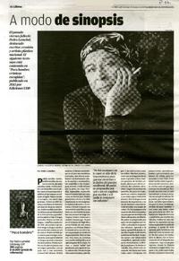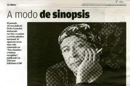 A modo de sinopsis [artículo] / Pedro Lemebel El Mercurio de Antofagasta (Diario : Antofagasta, Chile) enero 25, 2015, página 16 (Domingo) El Sur (Concepción, Chile : 1885) enero 25, 2015, página 14 (KU) .