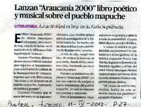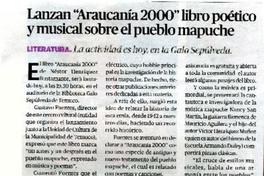 Lanzan "Araucanía 2000" libro poético y musical sobrel el pueblo mapuche. [artículo] Austral (Diario : Temuco, Chile)-- abr. 11, 2012, p. 27. .