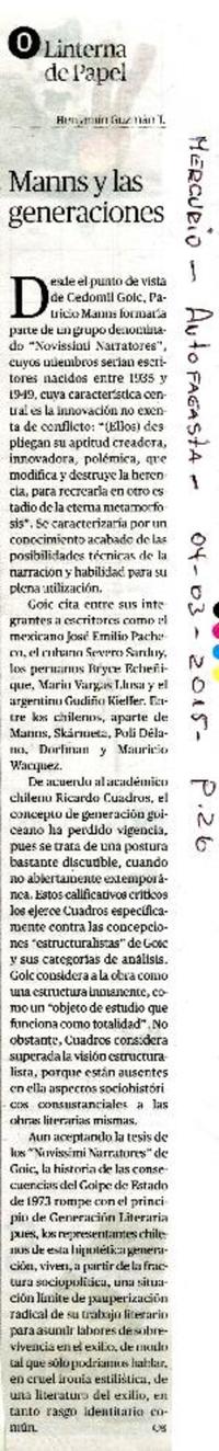 Manns y las generaciones [artículo] / Benjamín Guzmán T. El Mercurio (Diario : Antofagasta, Chile) marzo 04, 2015, p. 26 .