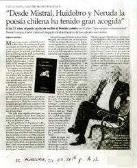 "Desde Mistral, Huidobro y Neruda la poesía chilena ha tenido gran acogida" [artículo] / Roberto Carega C. El Mercurio (Diario : Santiago, Chile) marzo, 22, 2015, p. A12 .