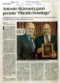 Antonio Skármeta ganó premio "Plácido Domingo". [artículo] El Mercurio (Diario : Antofagasta, Chile)-- feb. 21, 2012, p. 27. .