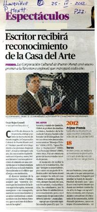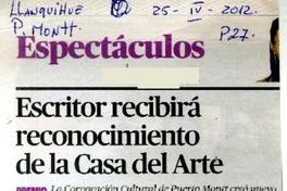 Escritor recibirá reconocimiento de la casa del arte [artículo] / Osar Rojas Connell. El Llanquihue (Diario : Puerto Montt, Chile)-- abr. 25, 2012, p. 27. .