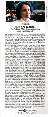 Claudia Barattini: "Lehabló a Chile desde el margen y con total libertad". [artículo] La Noche (Revista : Santiago, Chile)-- no 76 (feb. 2015), p. 14. .