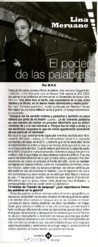 El poder de las palabras [entrevista] [artículo] / M.R.V. La Noche (Revista : Santiago, Chile)-- no 74 (dic. 2014), p. 16. .